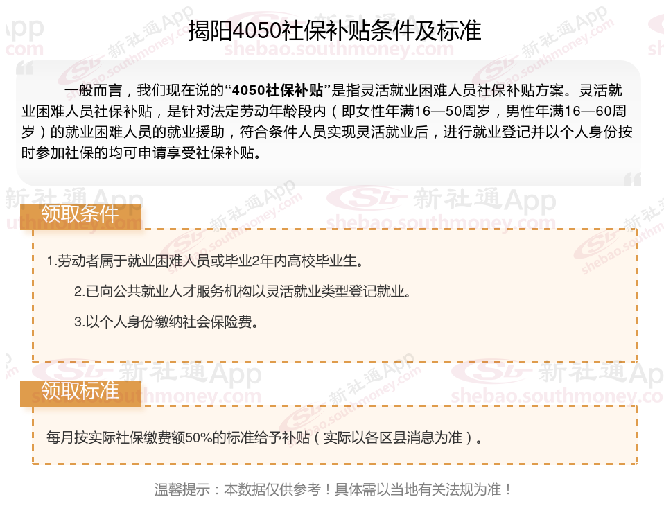2025揭阳灵活就业4050社保补贴是一项面向特定年龄段的就业困难人群的社会保险补贴。