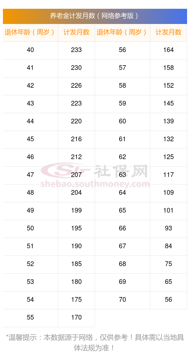 据了解,养老金计发月数是指养老金待遇计划发放的月数。目前,我国对于不同年龄段的退休职工,养老金计发月数有固定的法规。具体来说,60岁退休的职工,其个人账户养老金的计发月数为139个月;55岁退休的职工,计发月数为170个月;而50岁退休的职工,计发月数则为195个月。