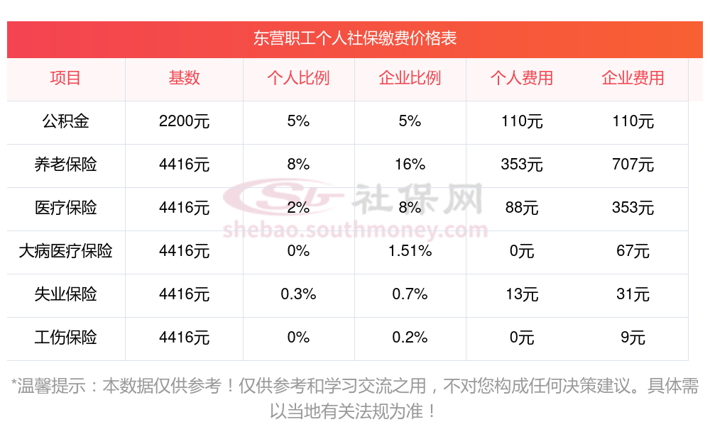 东营2025年社保缴费个人和公司各承担多少?下表是2025年东营社保费用明细参考,新社通app-社保缴费查询工具提供的最新数据如下: