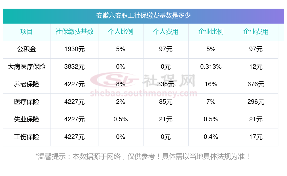 安徽六安2025年社保缴费个人和公司各承担多少?下表是2025年安徽六安社保费用明细参考,新社通app-社保缴费查询工具提供的最新数据如下: