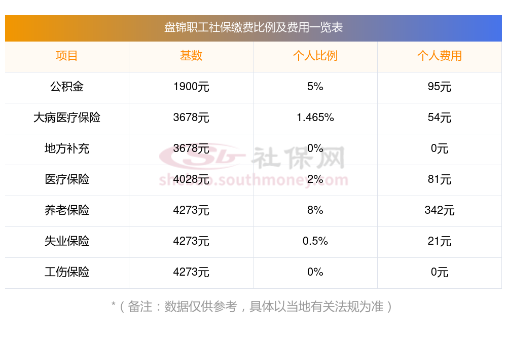 五险最新缴费标准,盘锦社保个人缴纳多少钱?下表是盘锦社保费用明细参考,根据新社通app-社保缴费查询工具提供的最新数据如下: