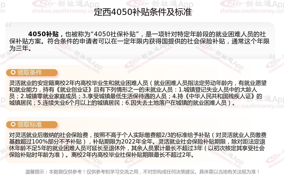 二、2025年定西4050社保补贴标准是多少?条件是什么?