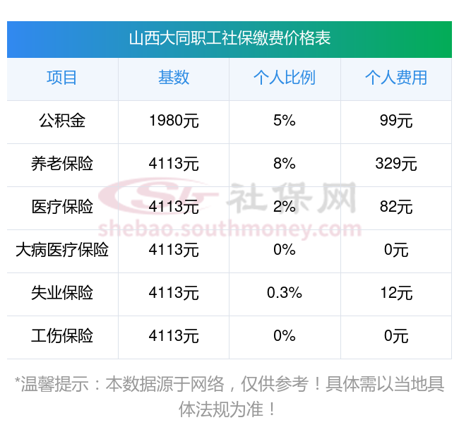 山西大同2025年社保缴费个人和公司各承担多少?下表是2025年山西大同社保费用明细参考,新社通app-社保缴费查询工具提供的最新数据如下: