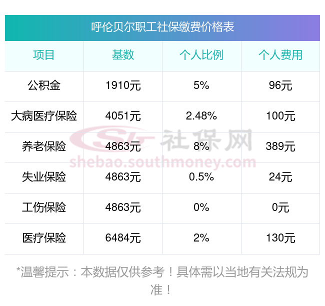 五险最新缴费标准,呼伦贝尔社保个人缴纳多少钱?下表是呼伦贝尔社保费用明细参考,根据新社通app-社保缴费查询工具提供的最新数据如下: