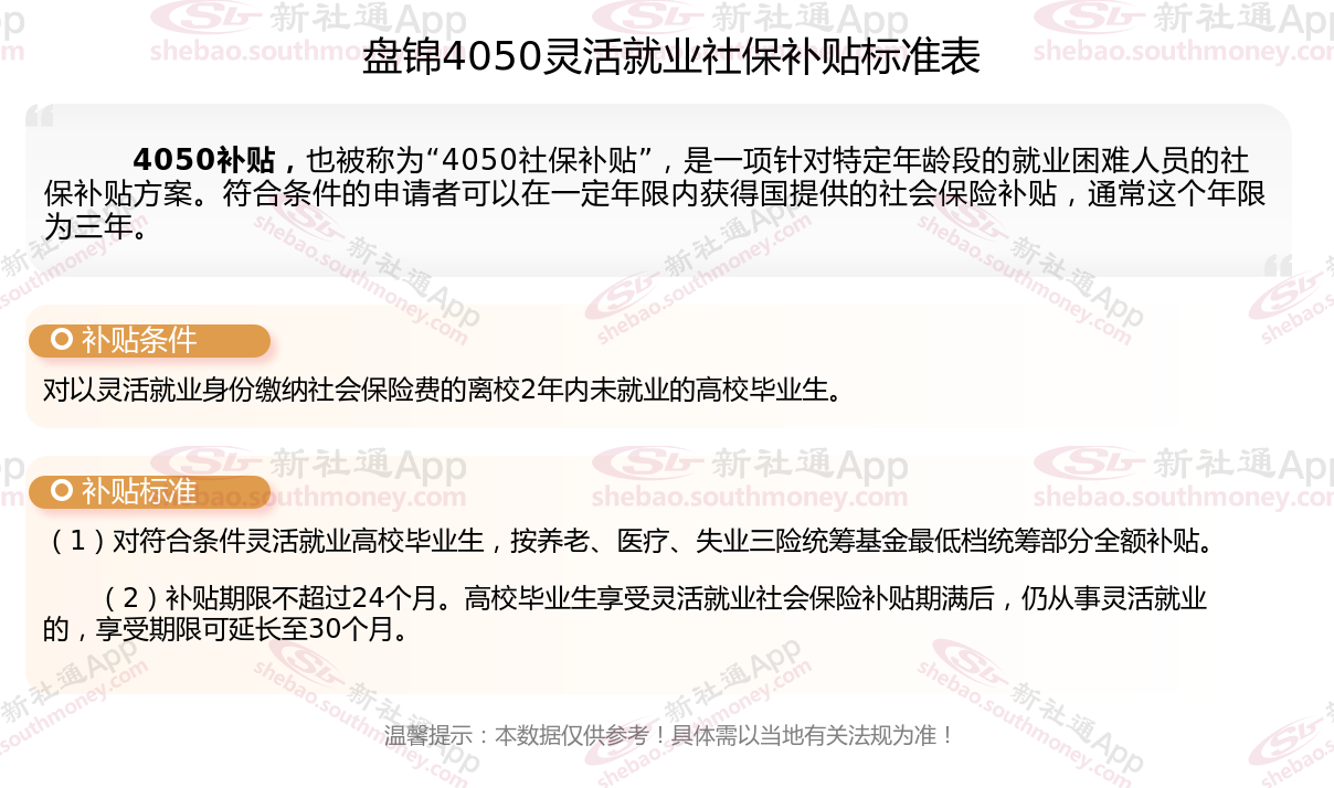 以上就是盘锦4050灵活就业社保补贴的相关内容,欢迎关注新社通/下载新社通APP了解更多五险一金专业资讯。