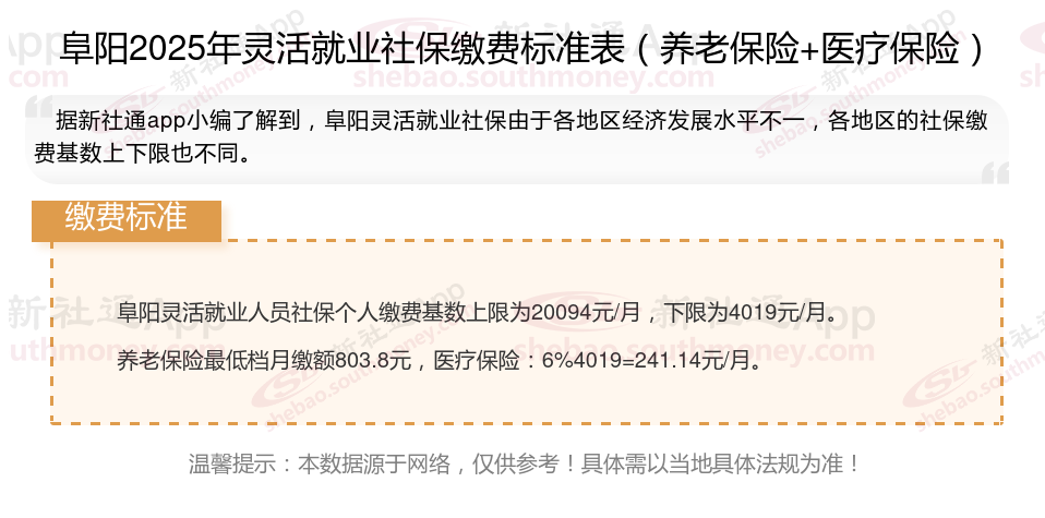 阜阳灵活就业人员参保月缴费金额是多少?2024-2025年度阜阳灵活就业人员社保缴费标准是多少?根据新社通app-社保缴费查询工具提供的2025社保缴费标准详情数据:
