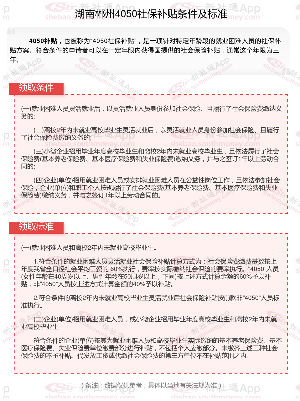 二、2025年湖南郴州4050社保补贴标准是多少?条件是什么?