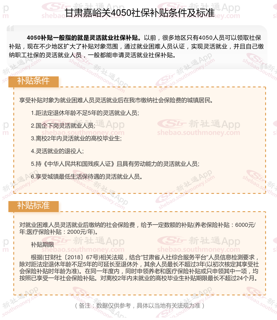 二、2025年甘肃嘉峪关4050社保补贴标准是多少?条件是什么?