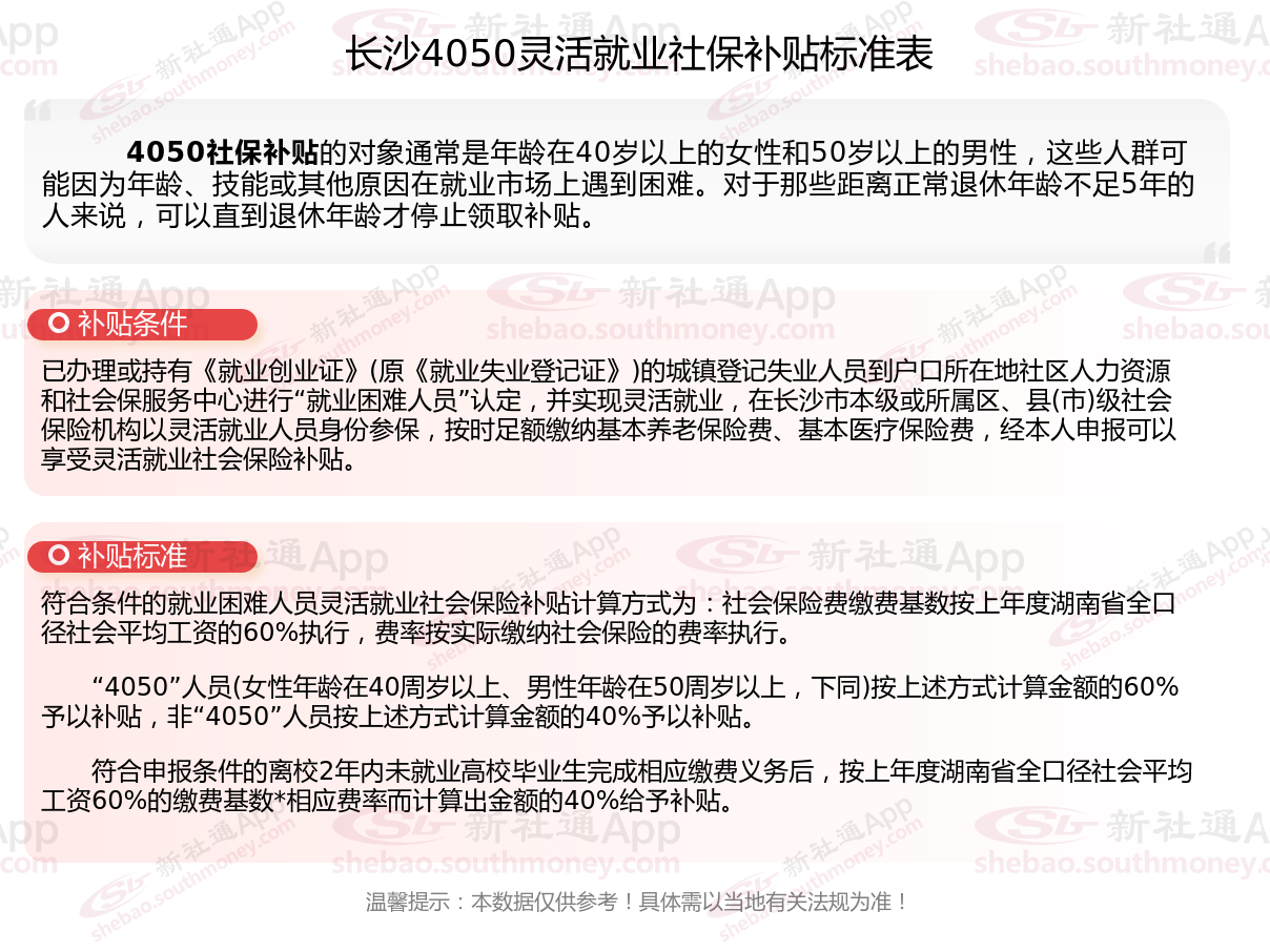 长沙4050灵活就业社保补贴标准如何?“4050补贴”需要以灵活就业身份参加职工养老和医疗保险,补贴标准不超过实际缴费的三分之二,最长3年,距离退休不足5年的可延长到退休。补贴对象包括国企下岗人员、低保家庭等。申请流程需要提交身份证、银行账户等。那么长沙4050灵活就业社保补贴标准是多少钱?长沙4050社保补贴条件是什么?接下来随新社通APP小编了解一下长沙4050灵活就业社保补贴标准最新资讯。