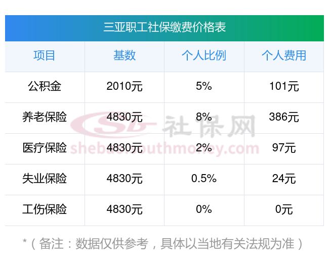 五险最新缴费标准,三亚社保个人缴纳多少钱?下表是三亚社保费用明细参考,根据新社通app-社保缴费查询工具提供的最新数据如下: