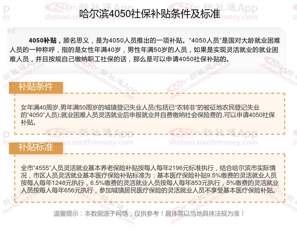 今天聊一下4050补贴话题。4050补贴听起来像是一个针对特定年龄人群的社保补贴。比如女性需年满40周岁,男性需年满50周岁(以申请当年12月31日为截止日期)。那么哈尔滨4050灵活就业社保补贴标准是多少钱?哈尔滨4050社保补贴条件是什么?接下来随新社通APP小编了解一下最新资讯。