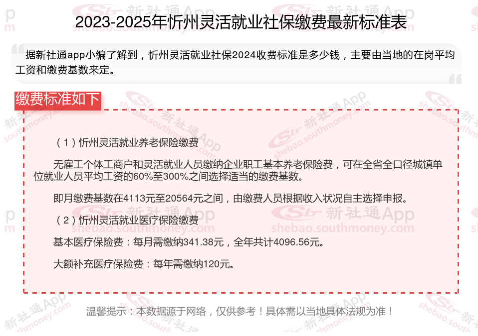 忻州灵活就业人员参保月缴费金额是多少?2024-2025年度忻州灵活就业人员社保缴费标准是多少?根据新社通app-社保缴费查询工具提供的2025社保缴费标准详情数据: