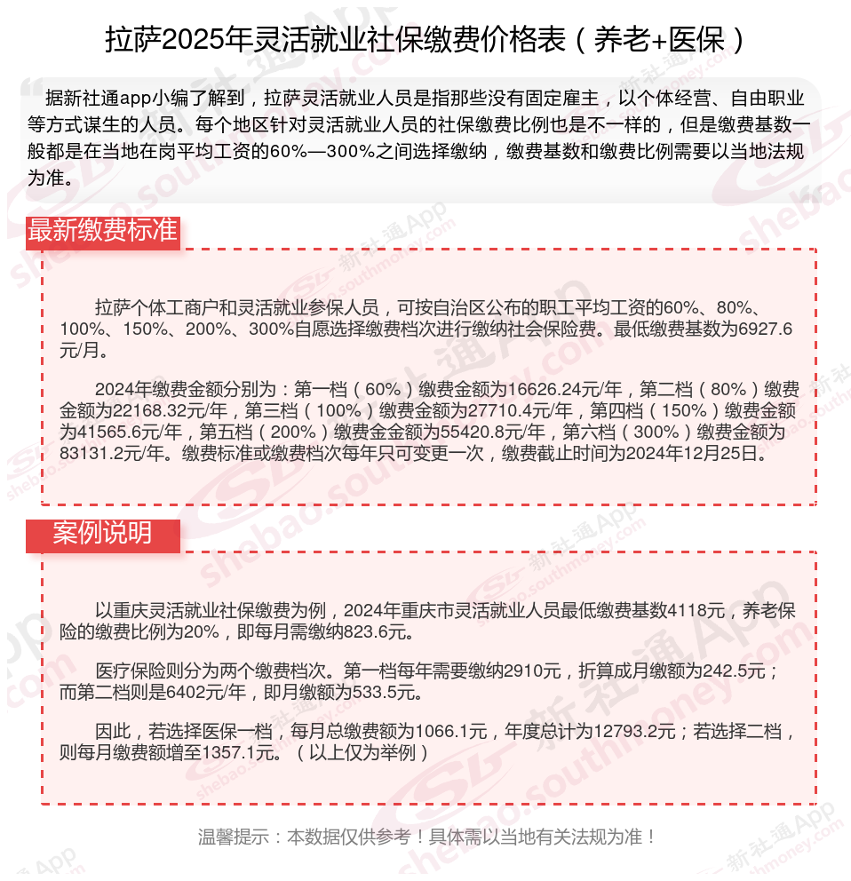 拉萨灵活就业人员参保月缴费金额是多少?2024-2025年度拉萨灵活就业人员社保缴费标准是多少?根据新社通app-社保缴费查询工具提供的2025社保缴费标准详情数据: