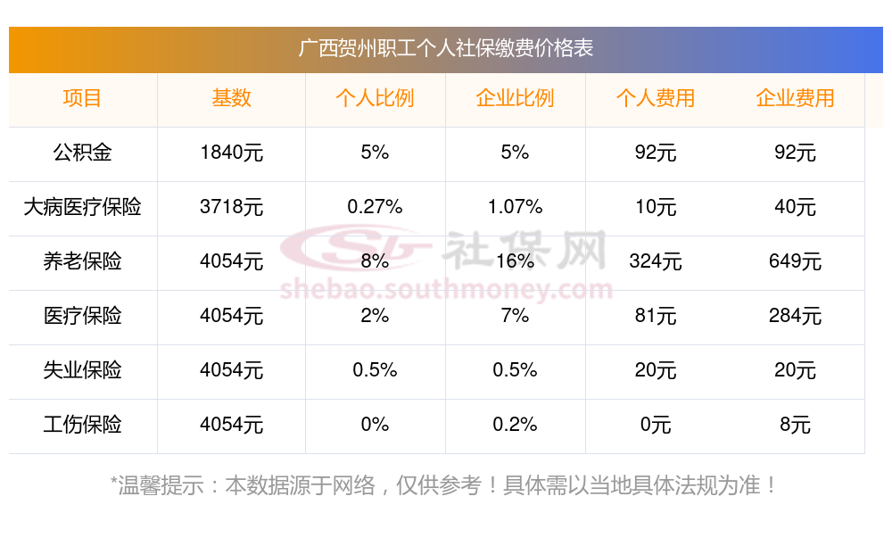 根据新社通app-社保缴费查询工具提供的最新数据,广西贺州地区2025年的社保缴费标准已经确定。以下是各项保险的缴费比例及相应金额(基于一定的缴费基数)的详细说明: