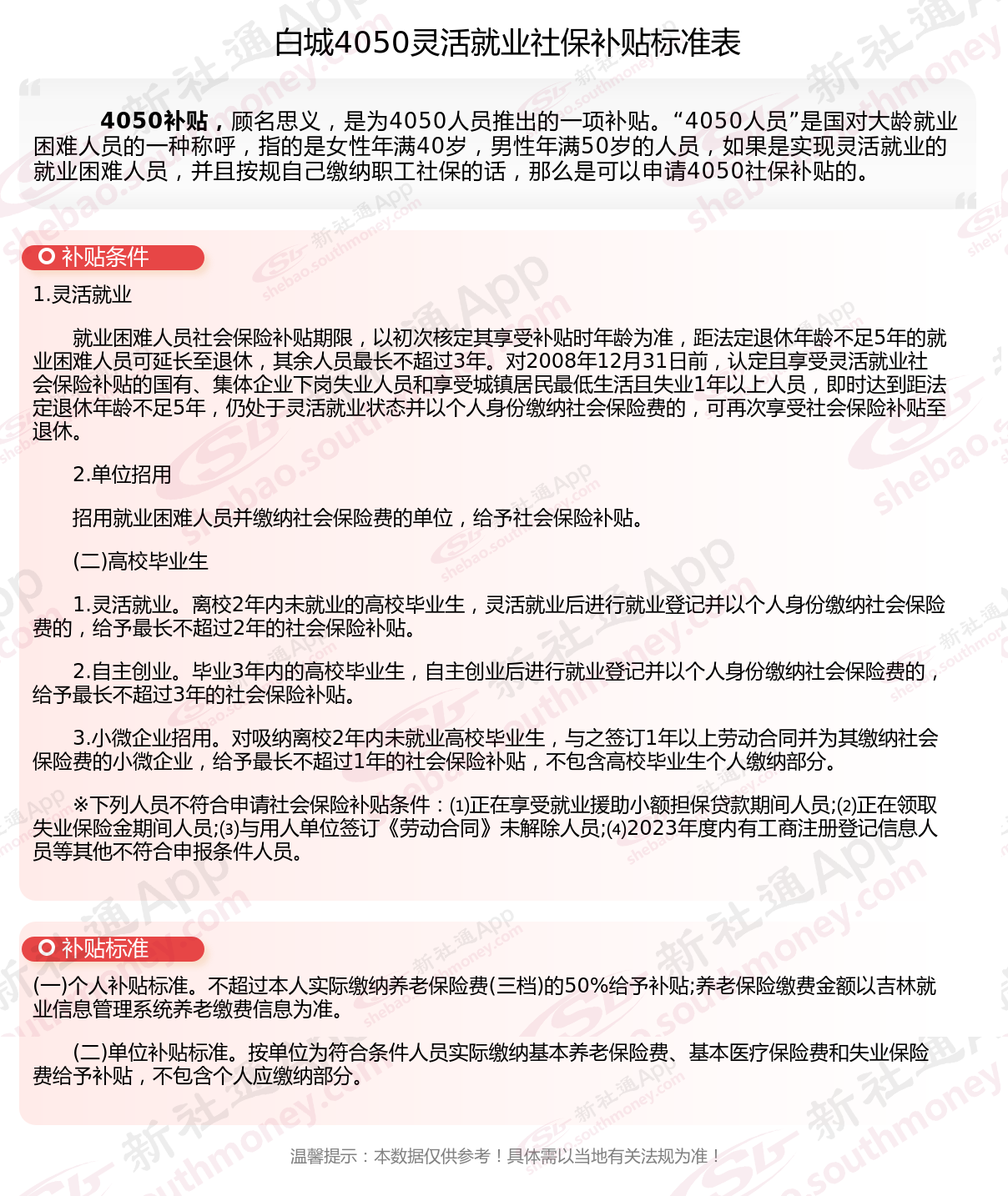 今天聊一下4050补贴话题。4050补贴听起来像是一个针对特定年龄人群的社保补贴。比如女性需年满40周岁,男性需年满50周岁(以申请当年12月31日为截止日期)。那么白城4050灵活就业社保补贴标准是多少钱?白城4050社保补贴条件是什么?接下来随新社通APP小编了解一下最新资讯。