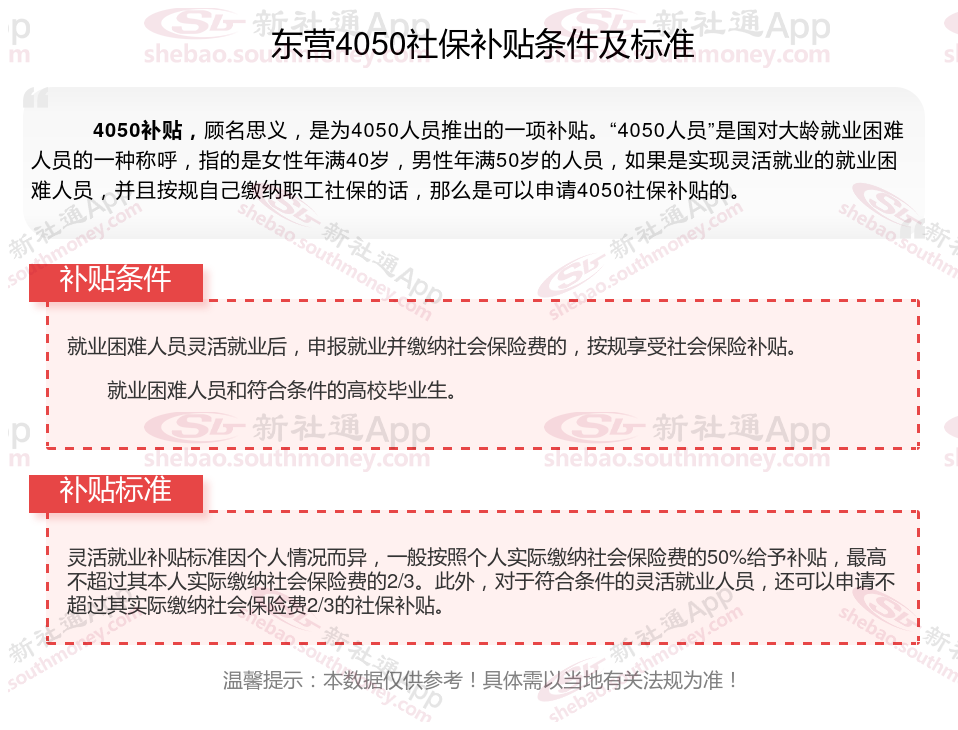 二、2025年东营4050社保补贴标准是多少?条件是什么?