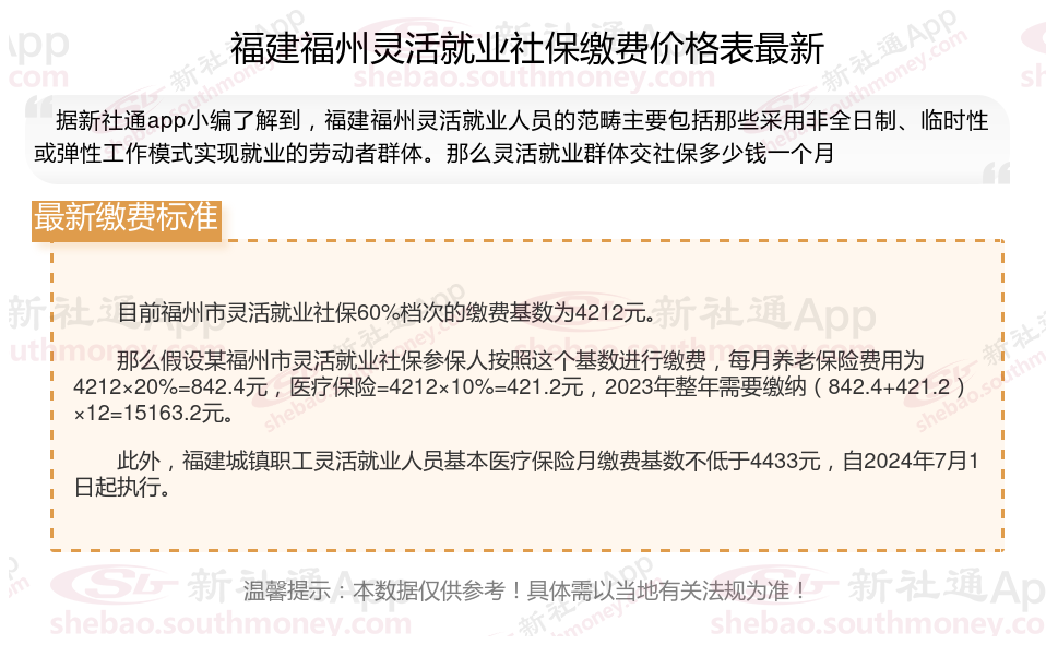 福建福州灵活就业人员参保月缴费金额是多少?2024-2025年度福建福州灵活就业人员社保缴费标准是多少?根据新社通app-社保缴费查询工具提供的2025社保缴费标准详情数据: