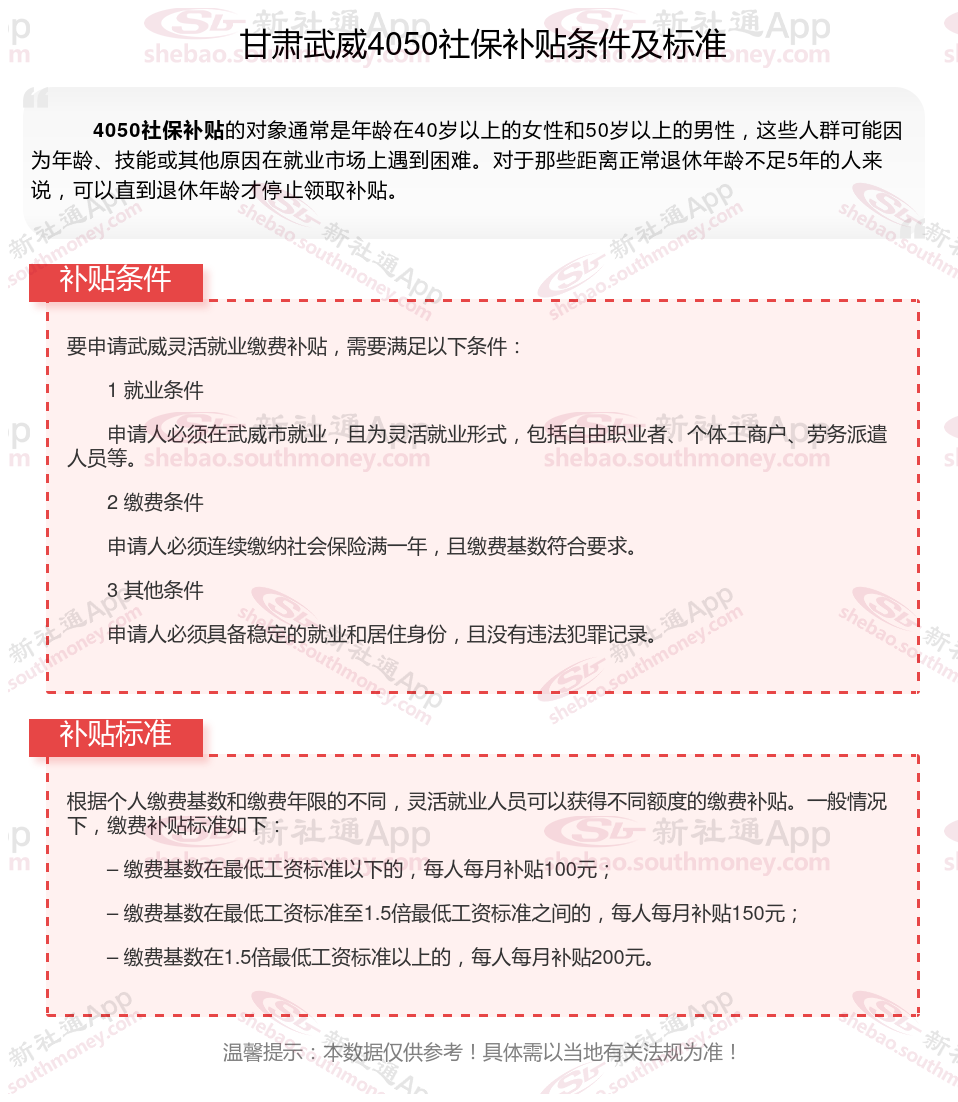 二、2025年甘肃武威4050社保补贴标准是多少?条件是什么?