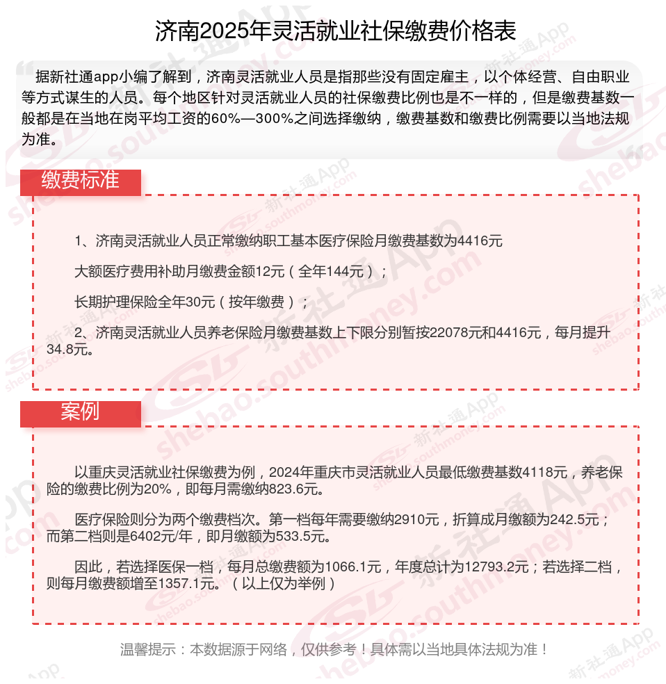 济南灵活就业人员参保月缴费金额是多少?2024-2025年度济南灵活就业人员社保缴费标准是多少?根据新社通app-社保缴费查询工具提供的2025社保缴费标准详情数据: