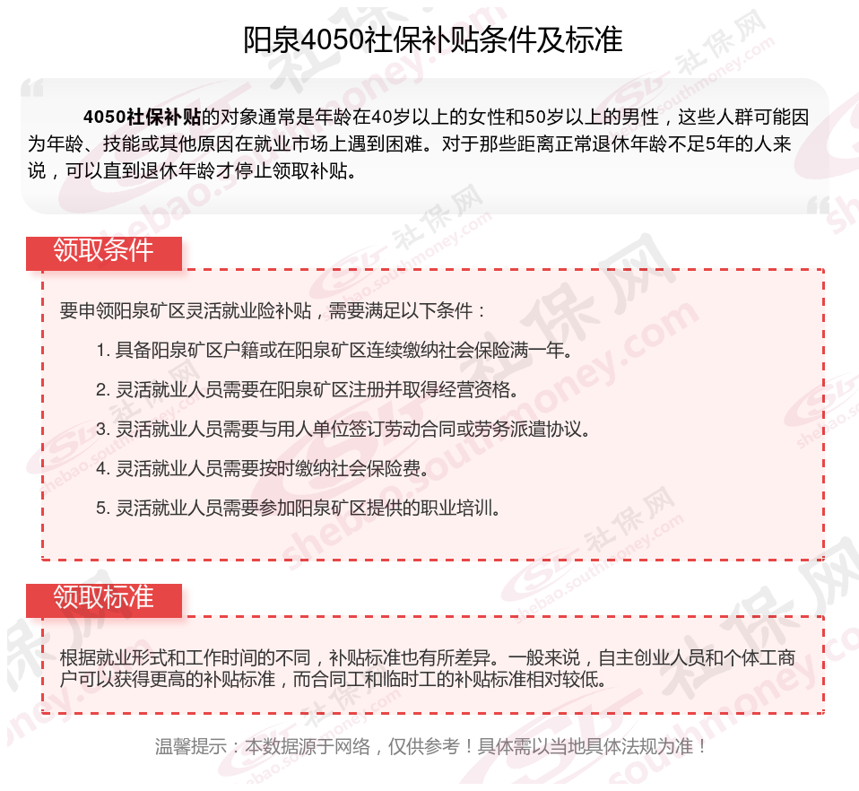 2024阳泉4050补贴主要针对的是年龄在40岁以上的女性和50岁以上的男性,这些人群通常因为年龄较大而面临就业困难。