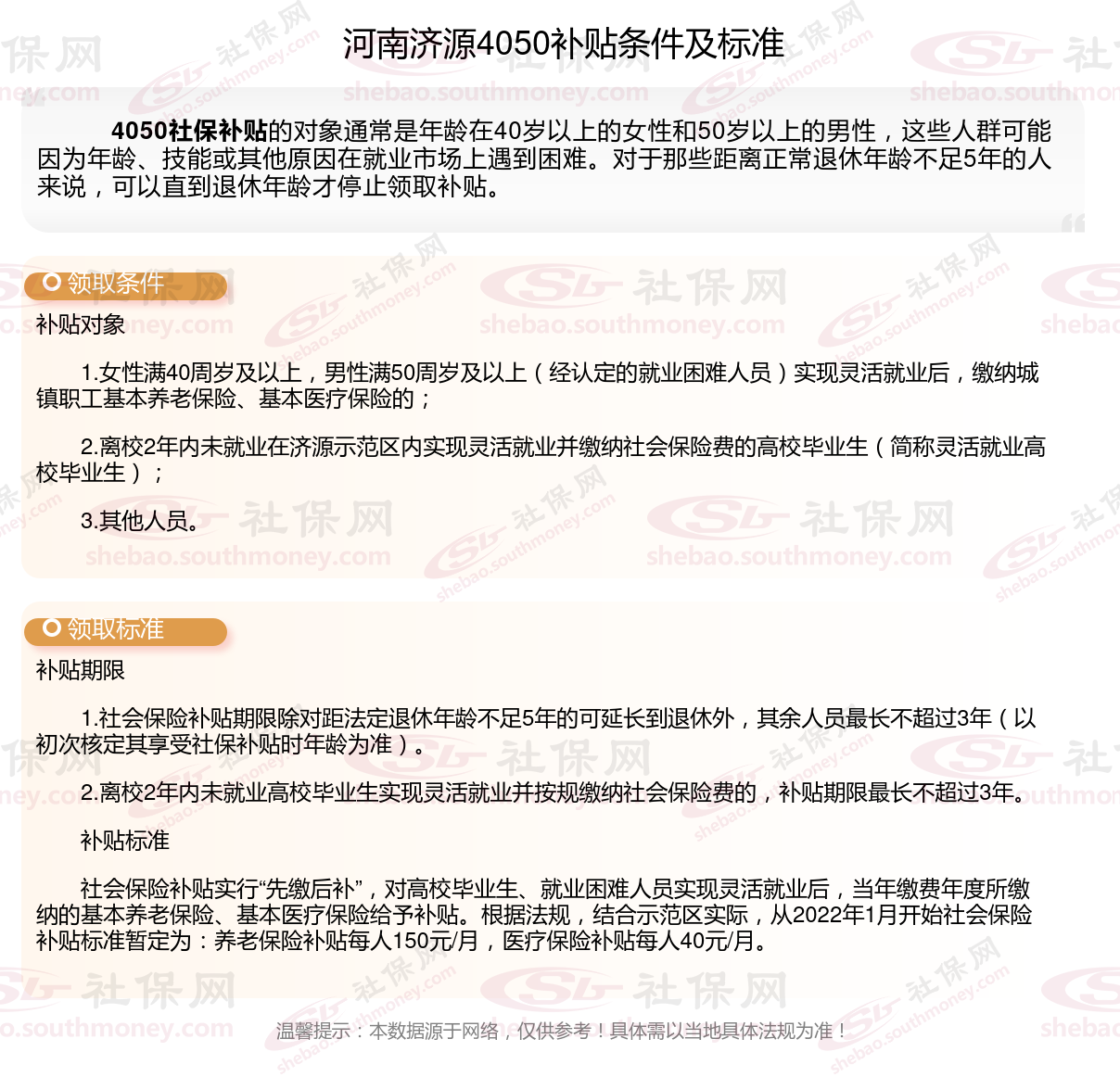 2024河南济源4050补贴主要针对的是年龄在40岁以上的女性和50岁以上的男性,这些人群通常因为年龄较大而面临就业困难。