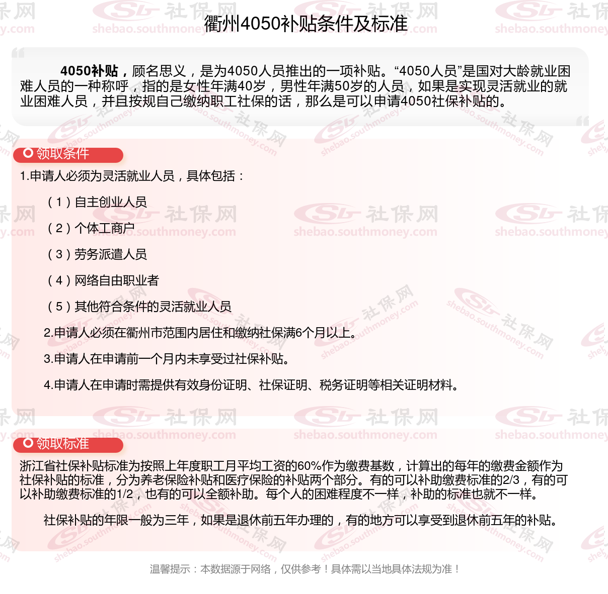 2024衢州灵活就业4050社保补贴是一项面向特定年龄段的就业困难人群的社会保险补贴。