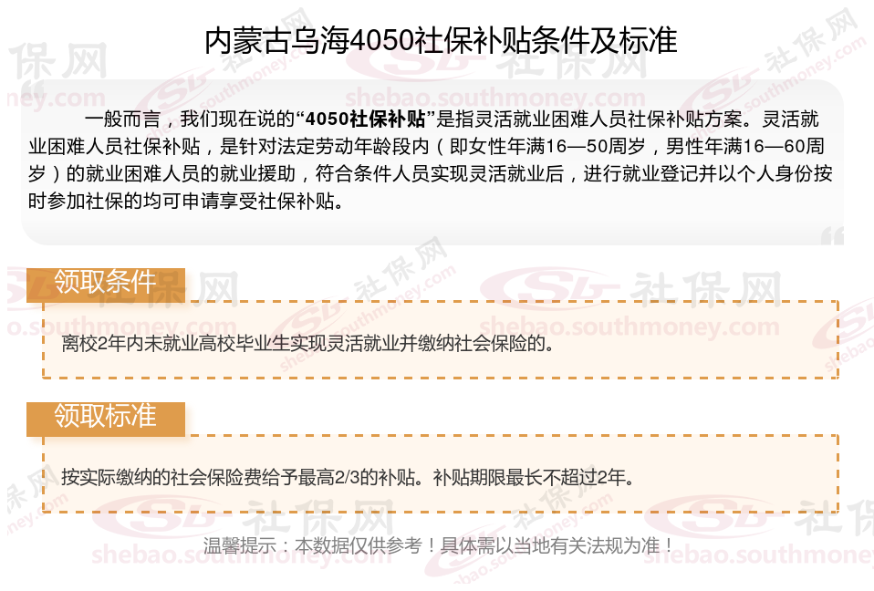 2024内蒙古乌海灵活就业4050社保补贴是一项面向特定年龄段的就业困难人群的社会保险补贴。