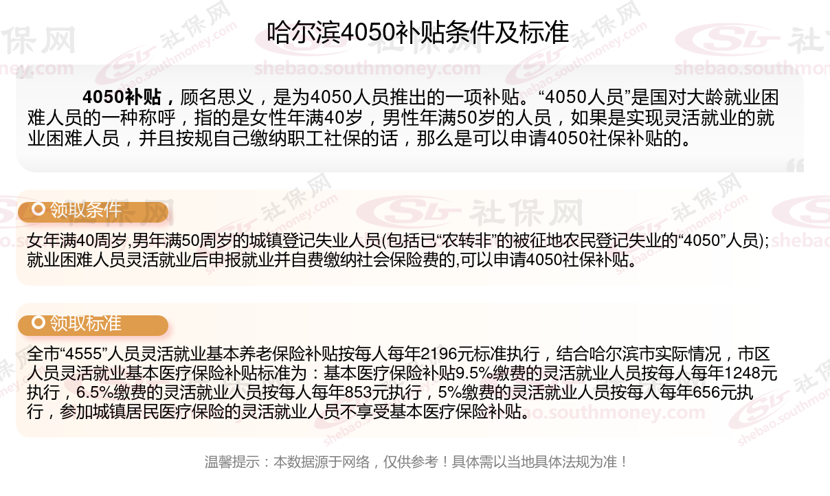 一、哈尔滨4050社保补贴标准及条件2023-2024年