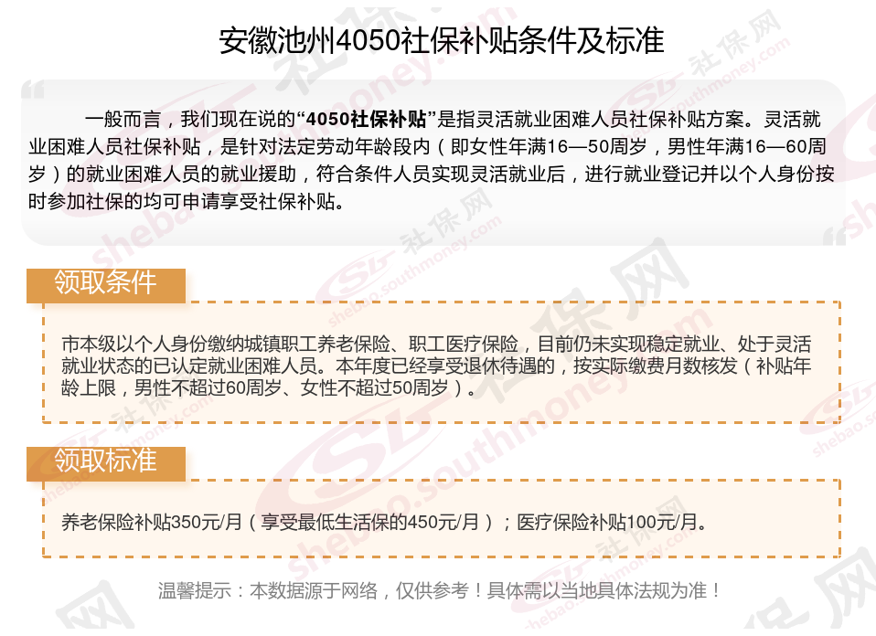 2024安徽池州4050补贴主要针对的是年龄在40岁以上的女性和50岁以上的男性,这些人群通常因为年龄较大而面临就业困难。