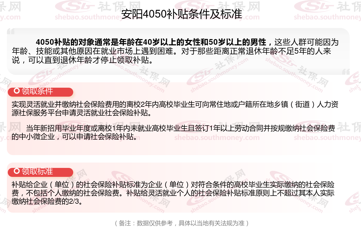 一、安阳灵活就业4050社保补贴标准及条件是什么