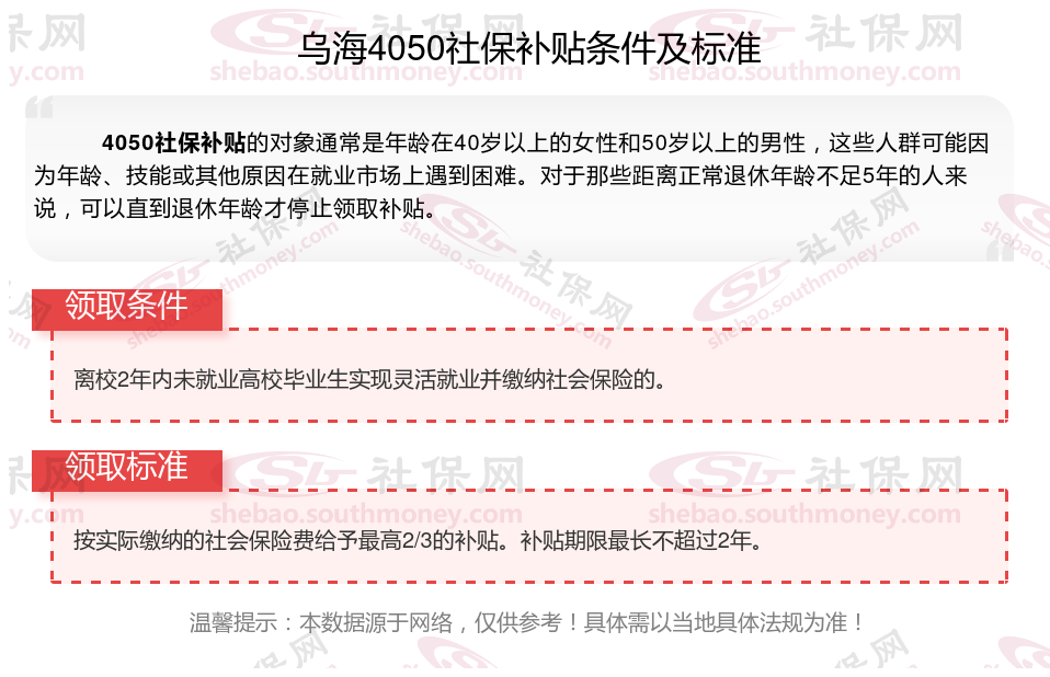 以上就是乌海4050灵活就业社保补贴的相关内容,欢迎关注社保网了解更多五险一金专业资讯。