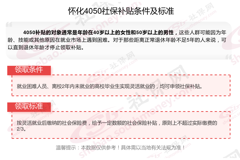 二、怀化灵活就业4050社保补贴标准及条件是什么