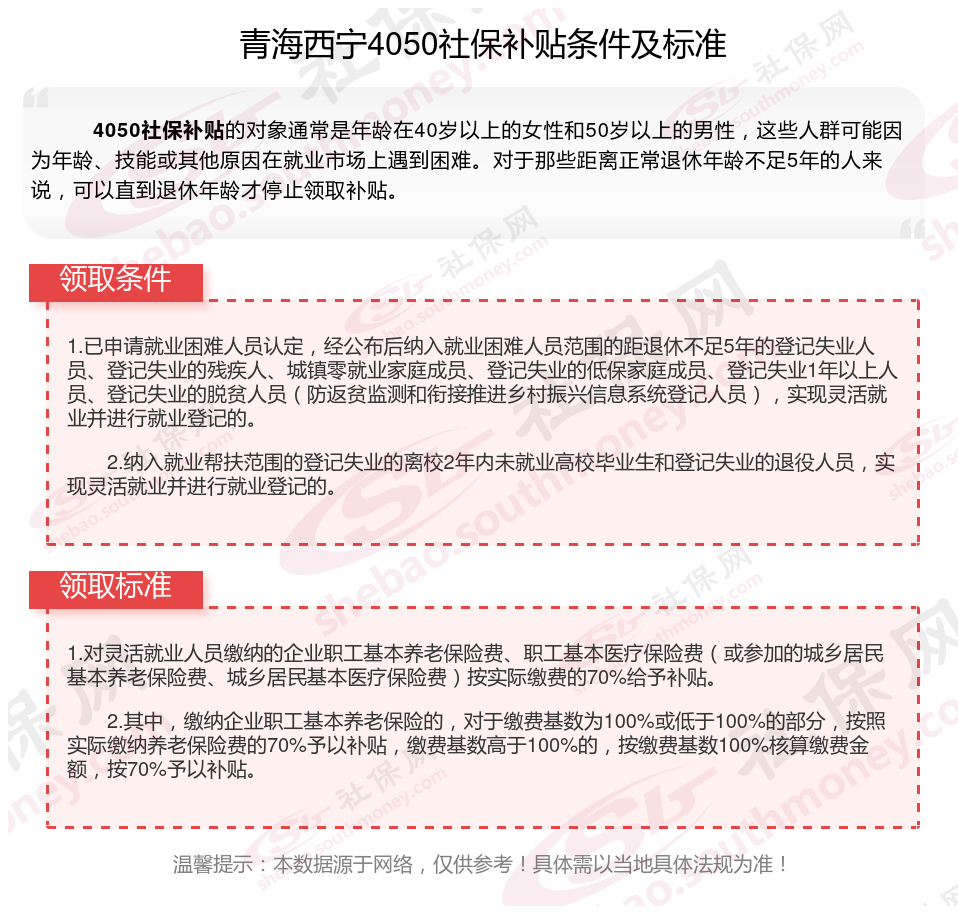 2024青海西宁4050补贴主要针对的是年龄在40岁以上的女性和50岁以上的男性,这些人群通常因为年龄较大而面临就业困难。