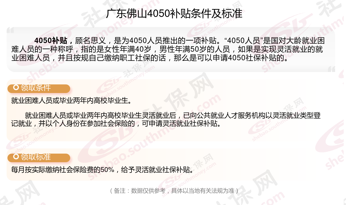 一、广东佛山4050社保补贴标准及条件2023-2024年