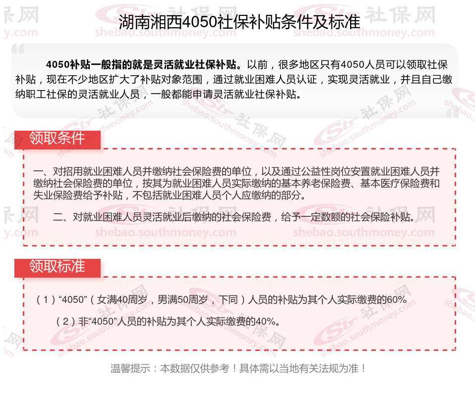 一、湖南湘西4050社保补贴标准及条件2023-2024年