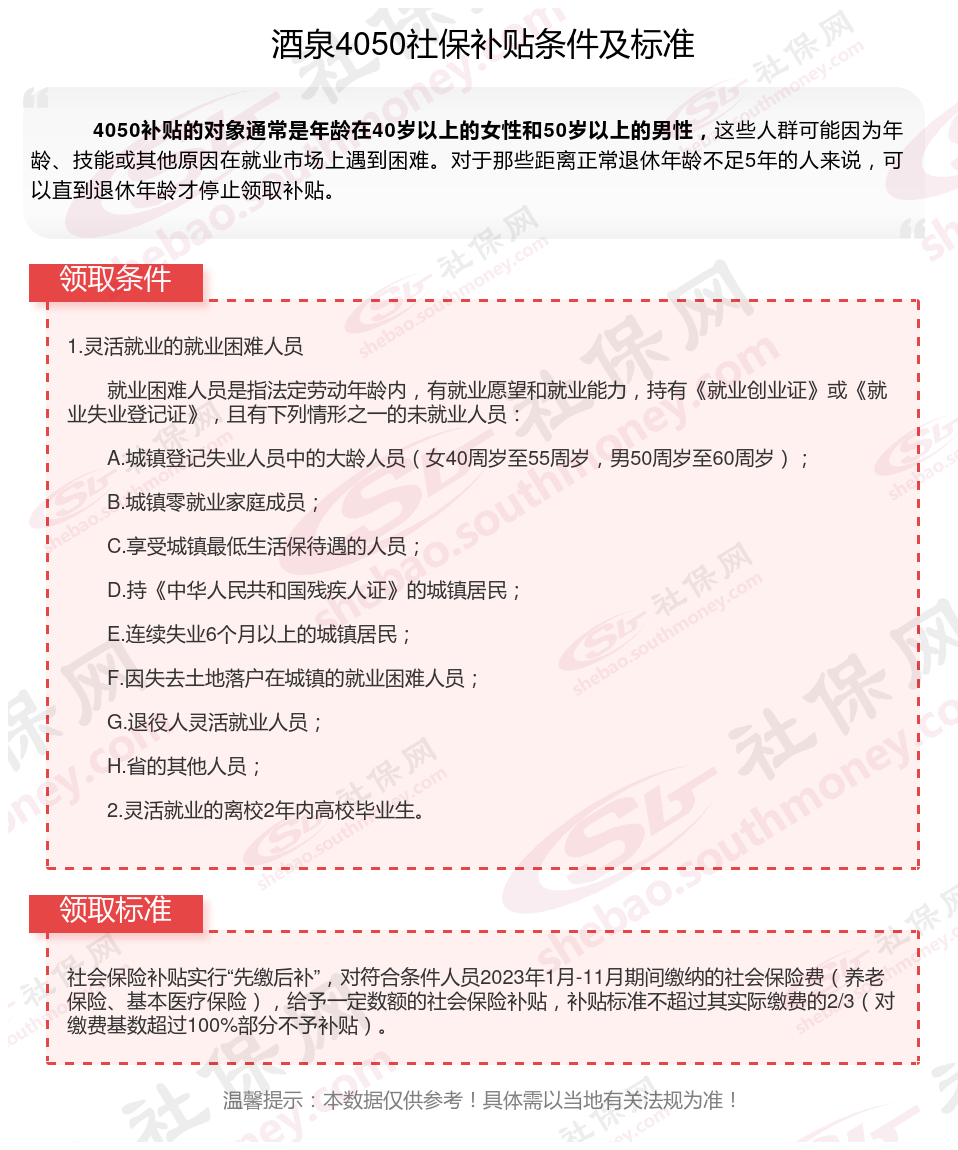 2024酒泉灵活就业4050社保补贴是一项面向特定年龄段的就业困难人群的社会保险补贴。