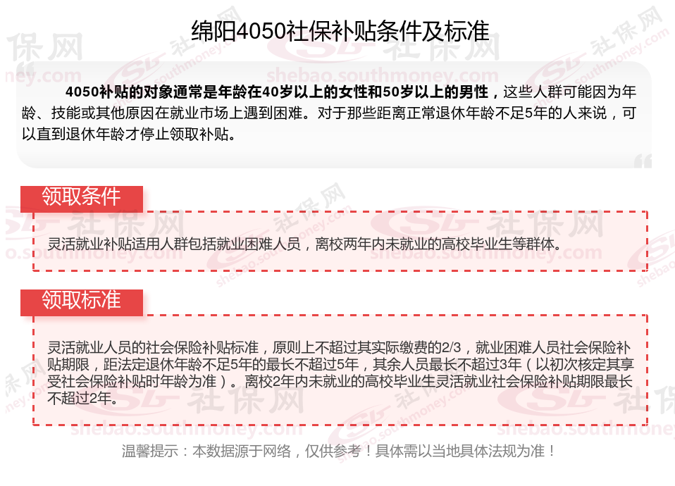 2024绵阳4050补贴主要针对的是年龄在40岁以上的女性和50岁以上的男性,这些人群通常因为年龄较大而面临就业困难。