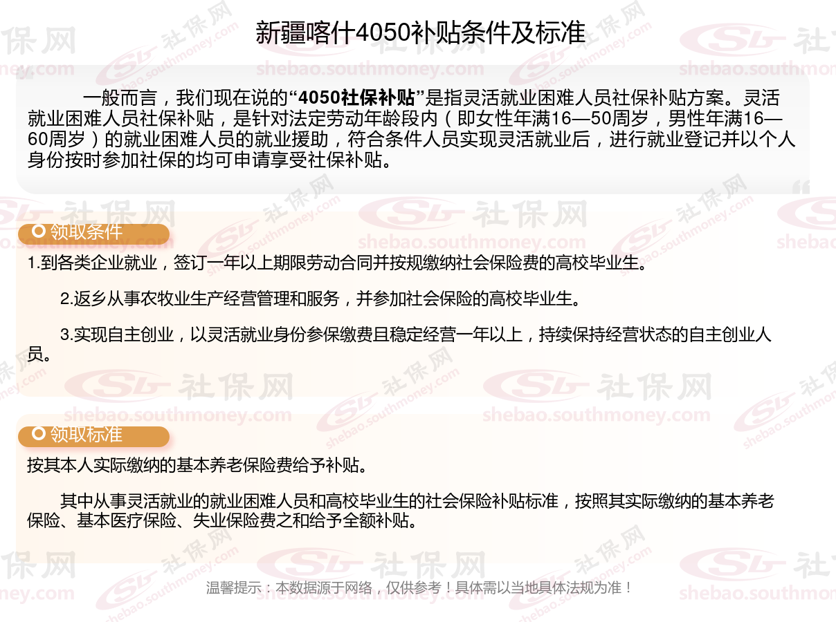 以上就是新疆喀什4050灵活就业社保补贴的相关内容,欢迎关注社保网了解更多五险一金专业资讯。
