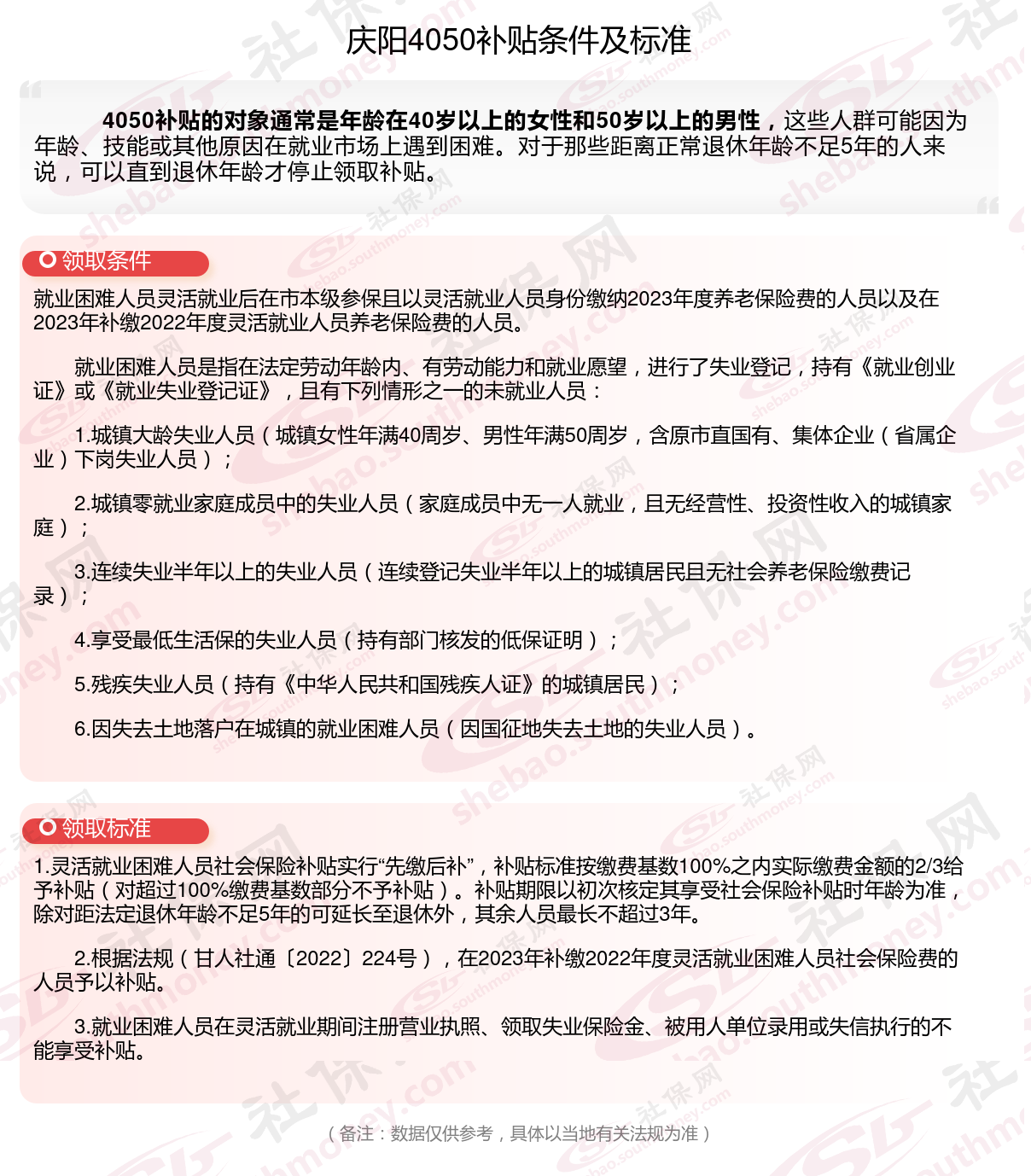 2024庆阳4050补贴主要针对的是年龄在40岁以上的女性和50岁以上的男性,这些人群通常因为年龄较大而面临就业困难。