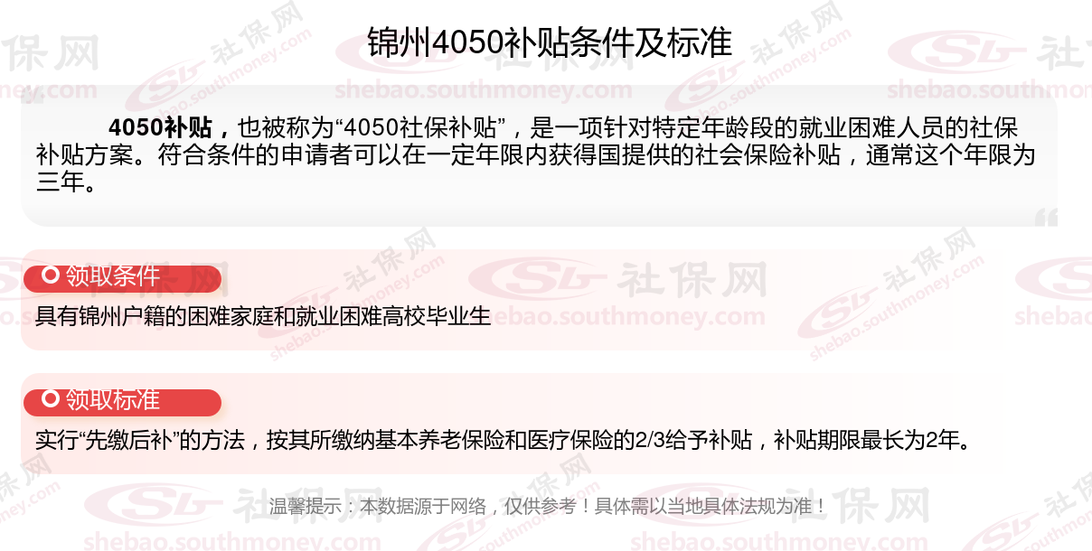 2024锦州4050补贴主要针对的是年龄在40岁以上的女性和50岁以上的男性,这些人群通常因为年龄较大而面临就业困难。