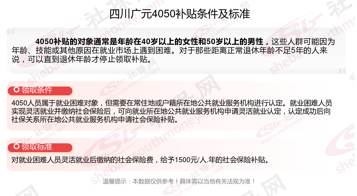 2024四川广元4050补贴主要针对的是年龄在40岁以上的女性和50岁以上的男性,这些人群通常因为年龄较大而面临就业困难。