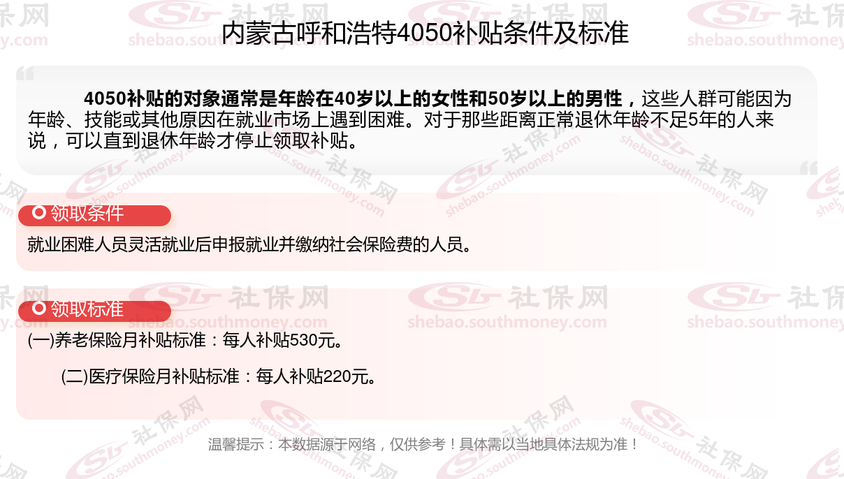 一、内蒙古呼和浩特4050社保补贴标准及条件2023-2024年