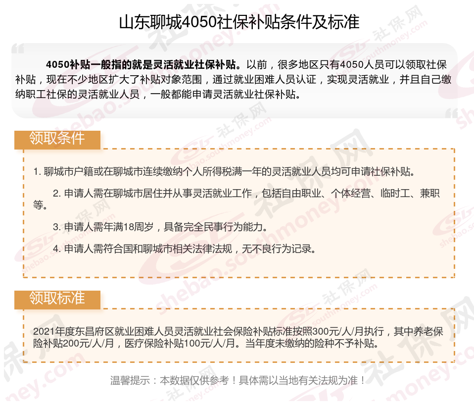二、山东聊城灵活就业4050社保补贴标准及条件是什么