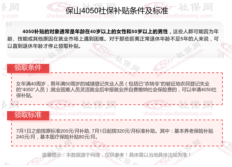 “4050人员”是国对大龄就业困难人员的一种称呼,指的是女性年满40岁,男性年满50岁的人员,那么保山4050灵活就业社保补贴标准是多少钱?保山4050社保补贴条件是什么?接下来随新社通APP小编了解一下最新资讯。