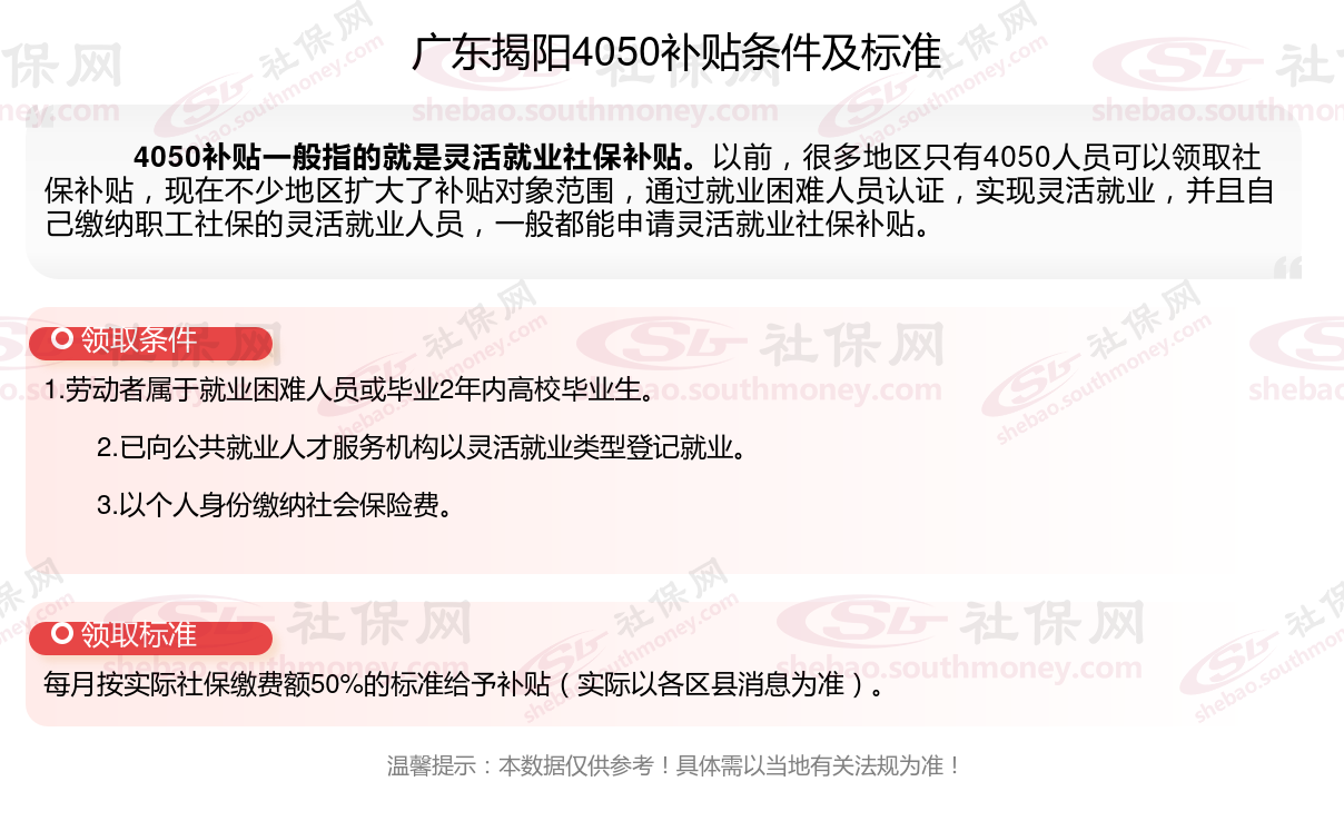 二、广东揭阳灵活就业4050社保补贴标准及条件是什么