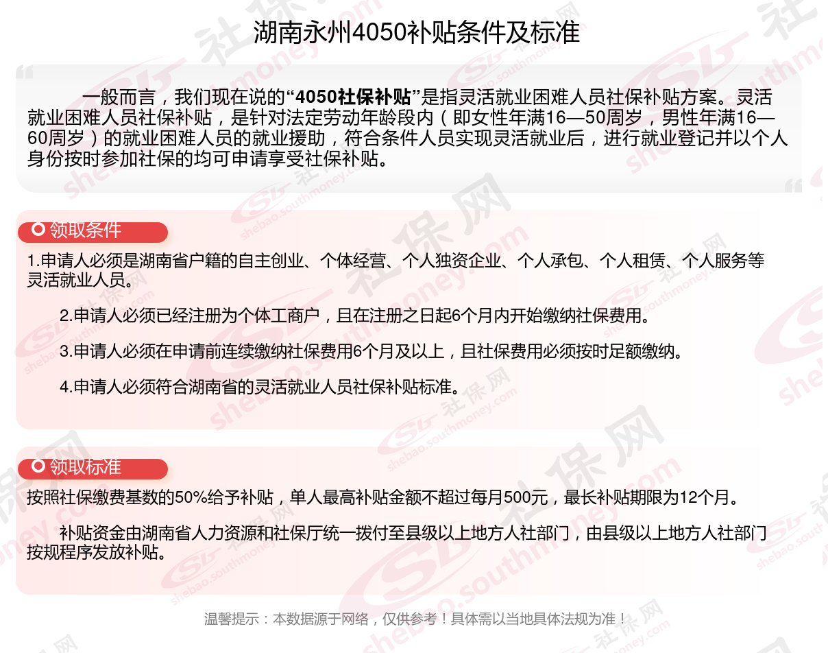 二、湖南永州4050社保补贴标准及条件2023-2024年,最新如下