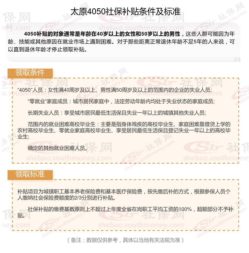 2024太原4050补贴主要针对的是年龄在40岁以上的女性和50岁以上的男性,这些人群通常因为年龄较大而面临就业困难。