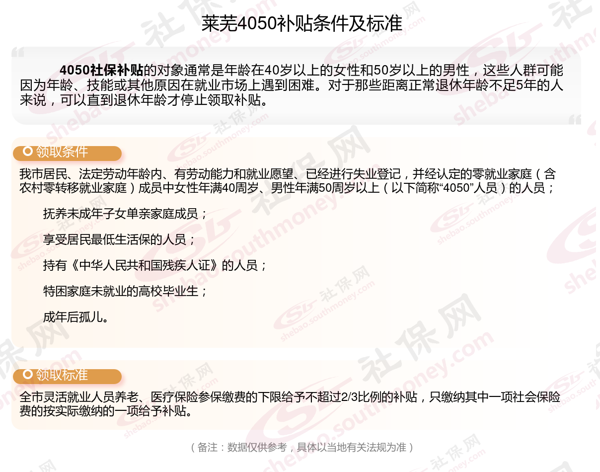 一、莱芜4050社保补贴标准及条件2023-2024年