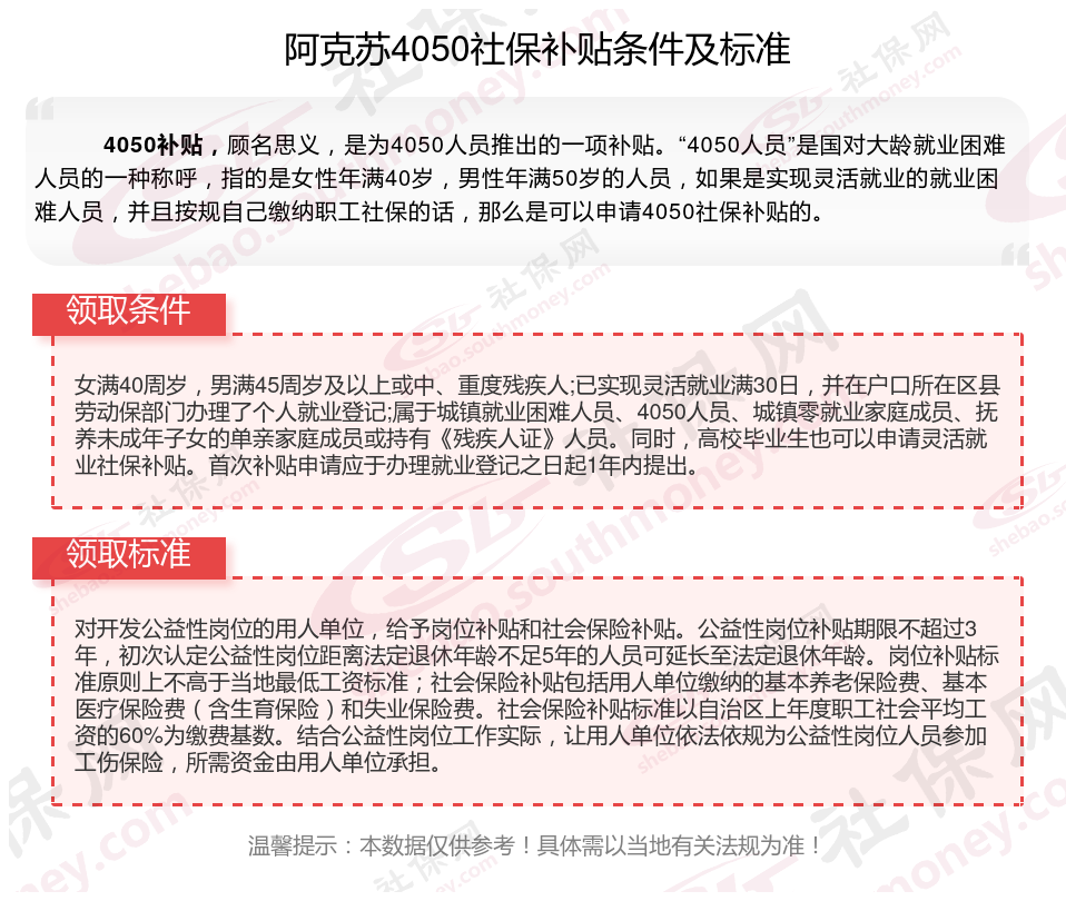 2024阿克苏灵活就业4050社保补贴是一项面向特定年龄段的就业困难人群的社会保险补贴。