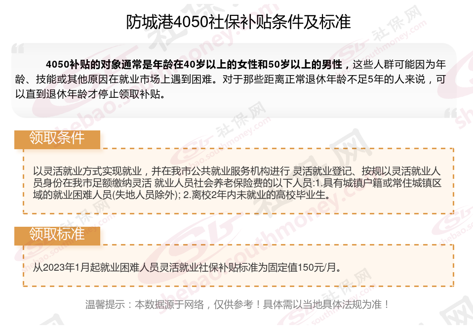 2024防城港4050补贴主要针对的是年龄在40岁以上的女性和50岁以上的男性,这些人群通常因为年龄较大而面临就业困难。